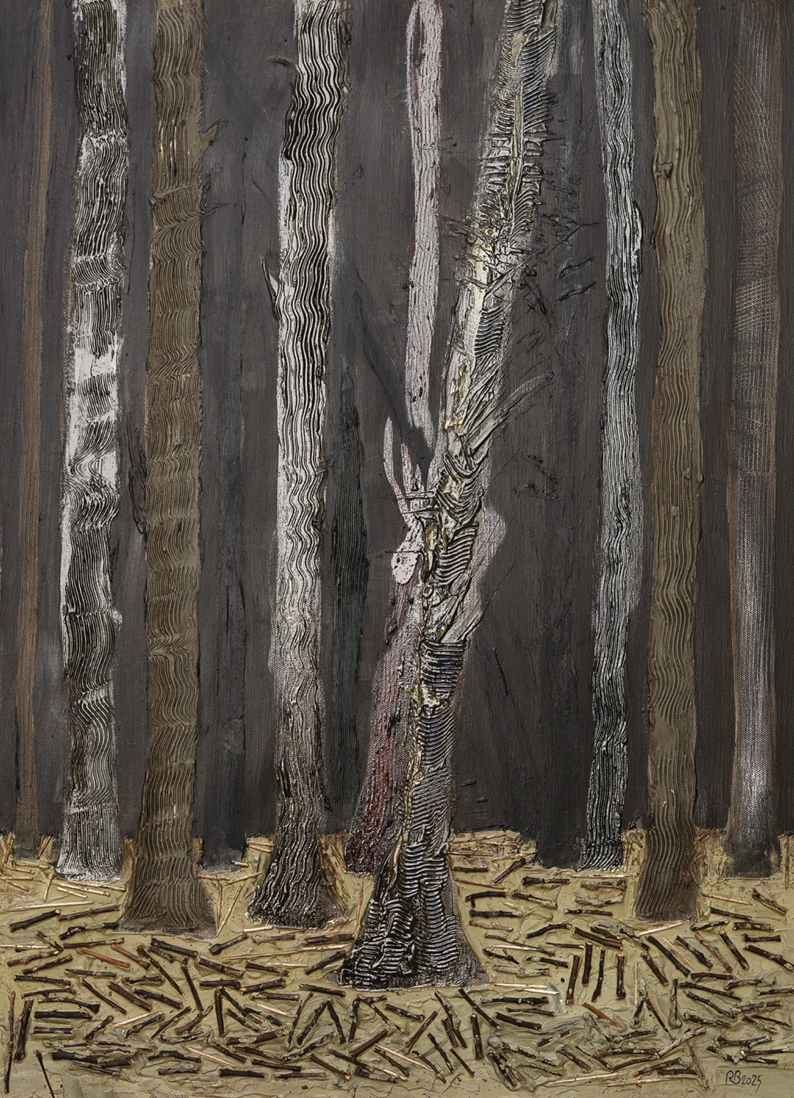 The work remains framed in the artist’s imaginary by golden background elements, also found in the Cultural Migration cycle, this time the lower register of the work depicting precisely "overpopulation". At Relu’s, the triptych Beizadele includes surprising metallic elements, such as sheets cut by the artist to form not only the clothing part of the three characters but also the pictorial surface of the portraits of two of the figures. Moreover, one of the three men has a crown on which real coins are stamped, the aspect of this triptych being one that extremely faithfully renders the conceptual basic idea of the work: forms without substance, sheet metal characters, lacking character, under the rule of unfounded wealth.
